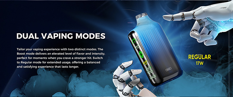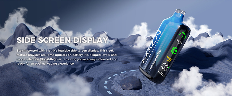 real-time updates on battery life, e-liquid levels, and mode selection (Boost/Regular),